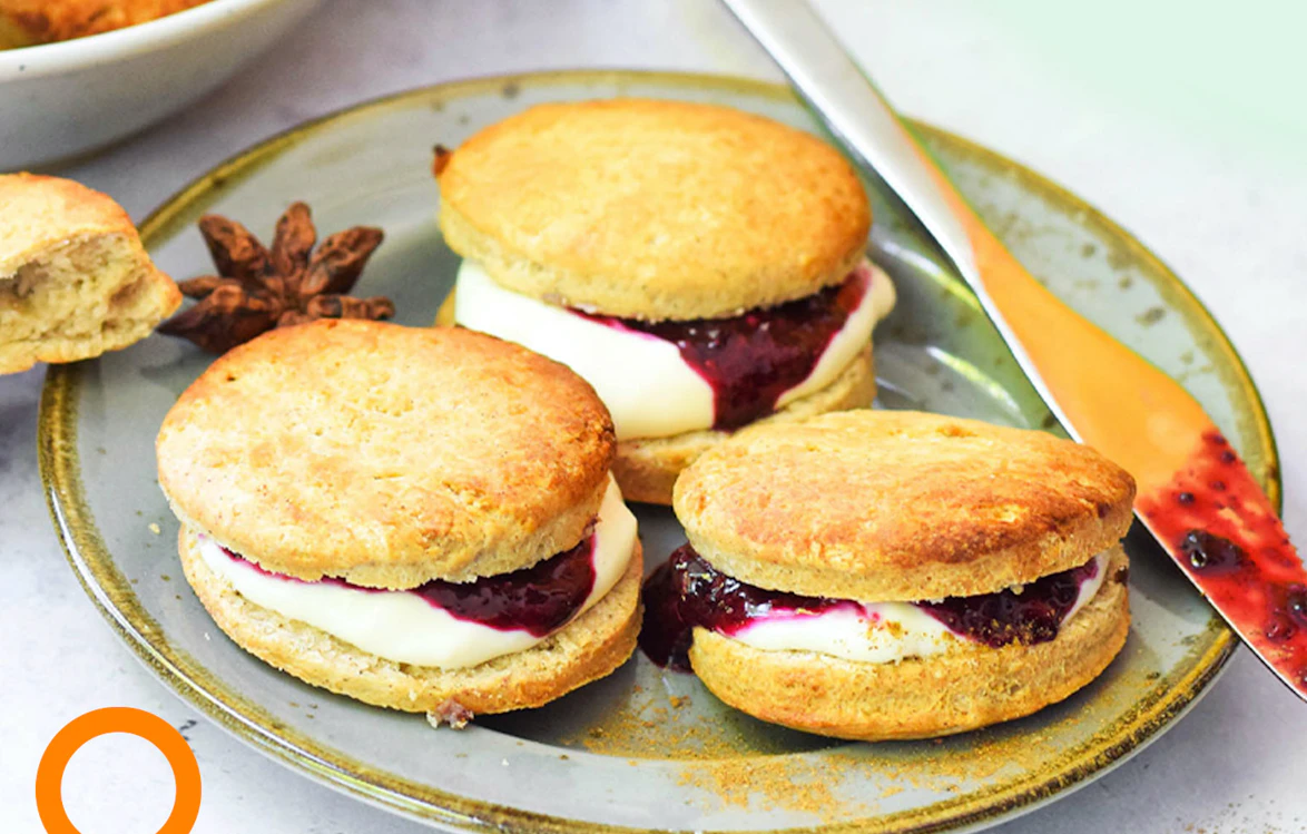 Optionally, cut the scones in half and spread them with a layer of fresh raspberry jam, coconut yogurt, or plant-based oat spread!