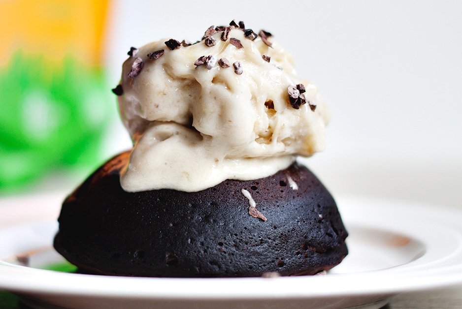Delicious mugcake with banana ice cream and 15 grams of protein each. Incredibly tasty and 100% plant-based!